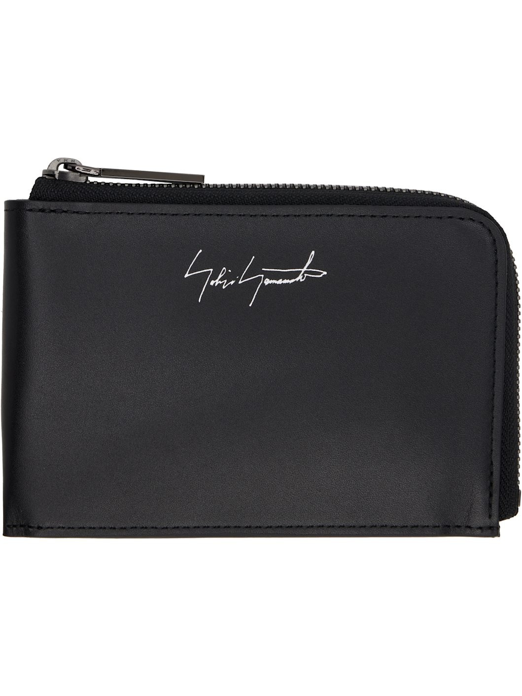 Buffed leather wallet. · Silver-tone logo stamp at face · Zip closure · Four card slots and one note slot at interior · Logo-engraved gunmetal-tone hardware · H4" x W5.75" x D0.5" Part of the discord YOHJI YAMAMOTO collection. Supplier color: Black Leather. Made in Japan 252573M164000