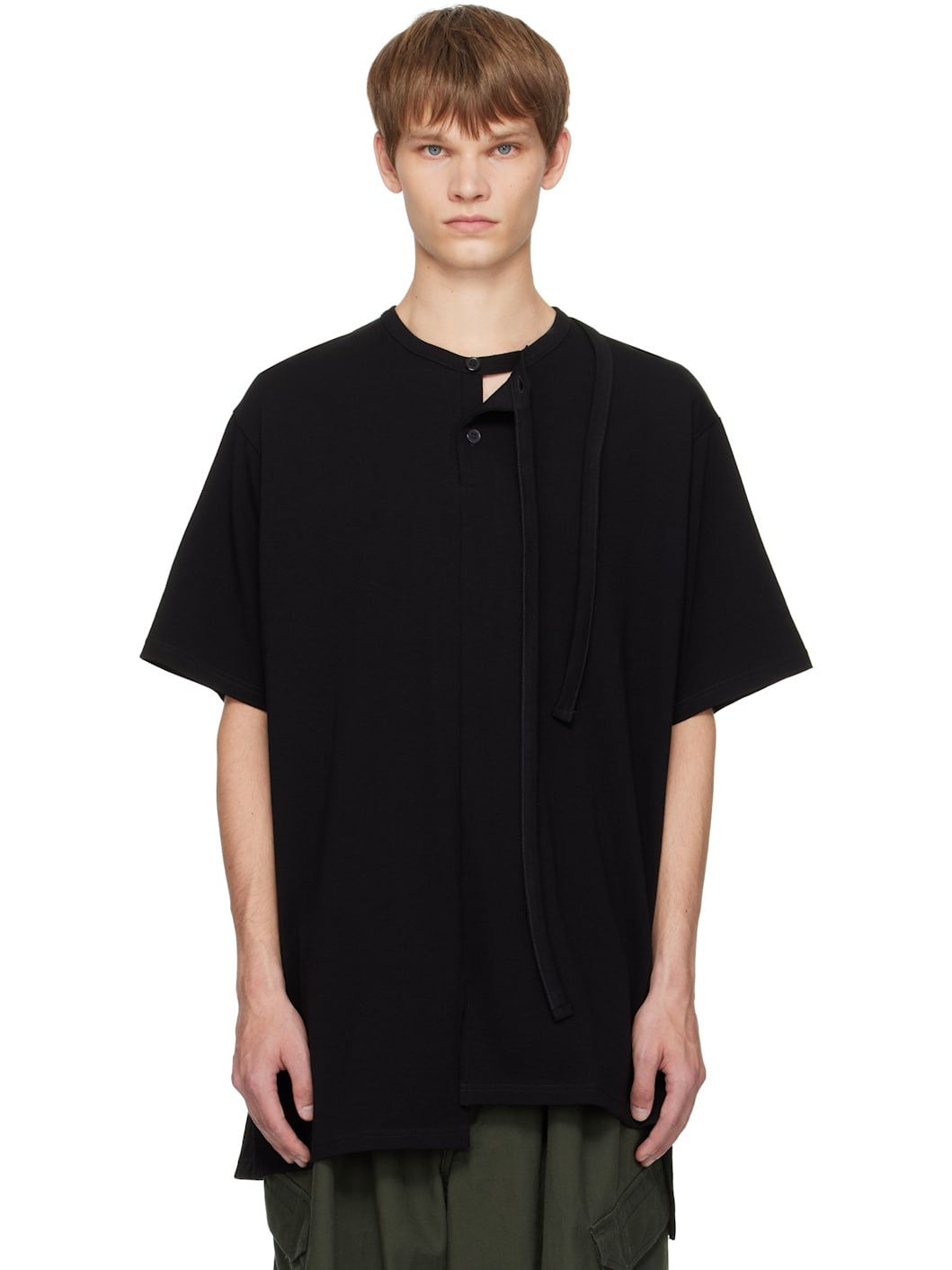 Cotton jersey T-shirt. · Extended trim at rib-knit crewneck · Two-button placket Part of the Yohji Yamamoto POUR HOMME collection. Supplier color: Black 100% cotton. Made in Japan 251573M211000