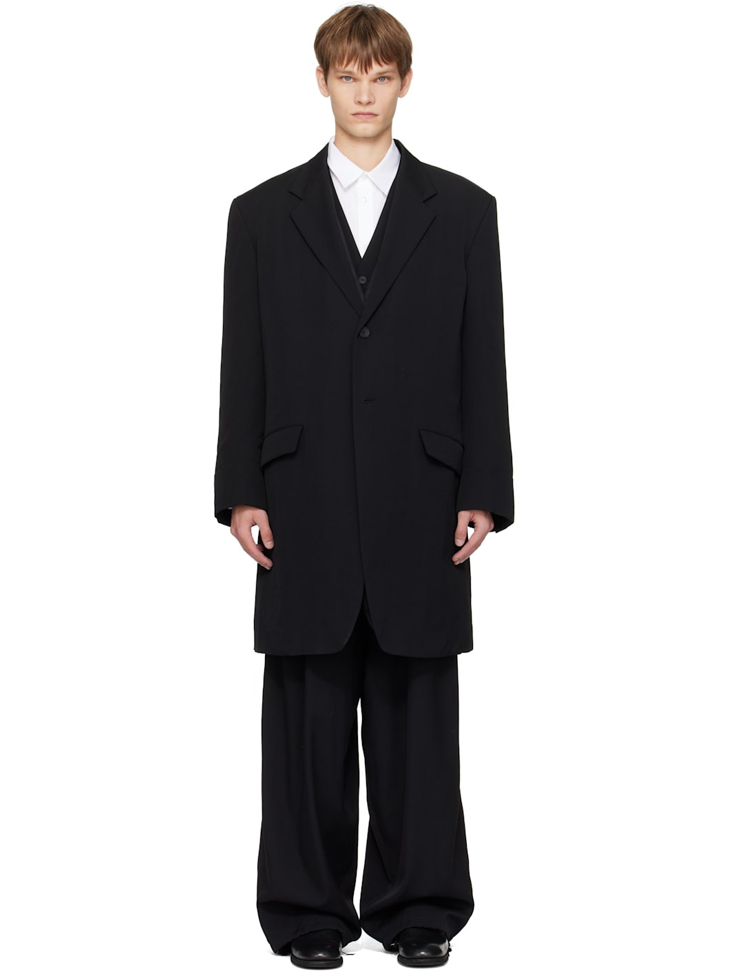 Wool gabardine blazer. · Notched lapel · Button closure · Flap pockets at waist · Cutout at armscyes · Button fastening at padded cuffs · Central vent at back hem · Press-stud fastening at inner collar · Welt pockets at interior · Adjustable button tab at inner waist Reversible and detachable nylon taffeta liner. · Quilted and padded · V-neck · Button closure · Patch pockets at waist · Central vent with button tab at back hem · Press-stud fastening at inner collar Part of the Yohji Yamamoto POUR HOMME collection. Supplier color: Black Body: 100% wool. Lining 1: 100% cupro. Lining 2: 100% nylon. Fill 1: 100% polyester. Fill 2: 100% polyester. Made in Japan 252573M195002