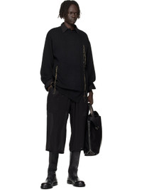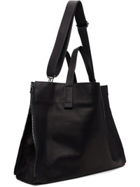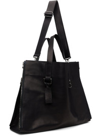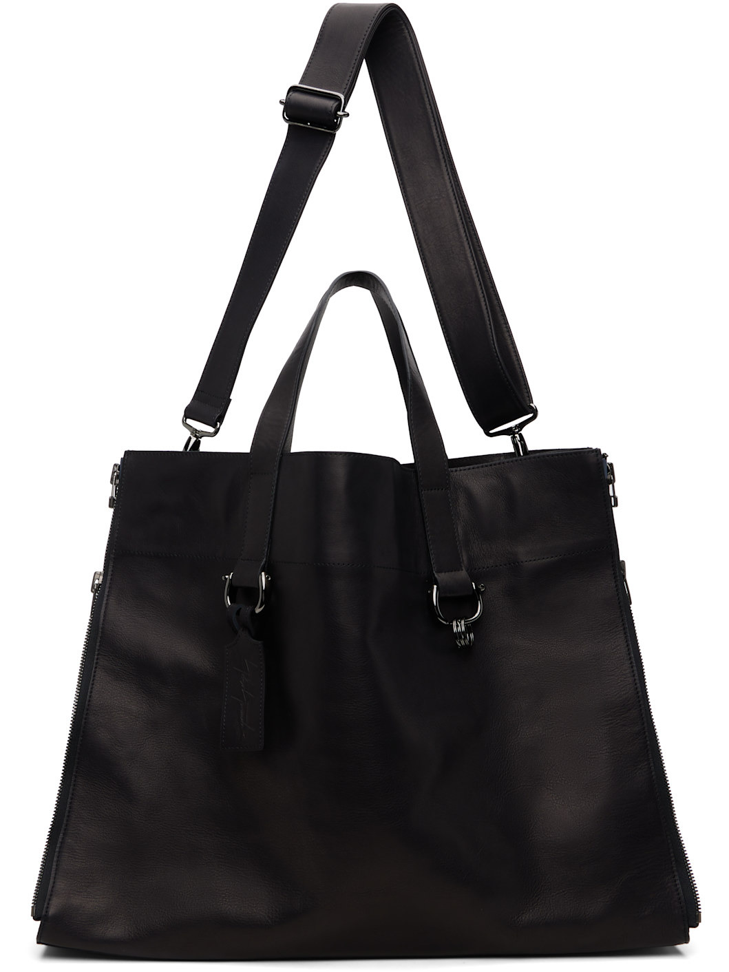 Buffed leather tote. · Fixed shoulder straps · Adjustable and detachable crossbody strap · Detachable logo tag and key rings at strap · Two-way zip expansion panel at sides · Magnetic closure · Patch pockets and zip pocket at interior · Twill lining · H14" x W19.5" x D5" Part of the discord YOHJI YAMAMOTO collection. Supplier color: Black Leather. Made in Japan 252573M172003