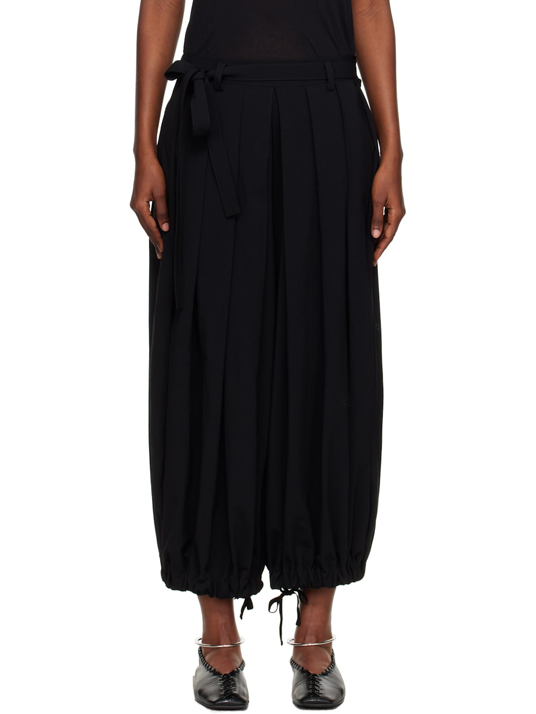 Wool twill trousers. · Pleats throughout · Belt loops · Integrated self-tie belt at elasticized waistband · Single-pocket styling · Zip fly · Dropped inseam · Self-tie straps at elasticized cuffs Supplier color: Black 1000% wool. Made in Japan 251731F086012