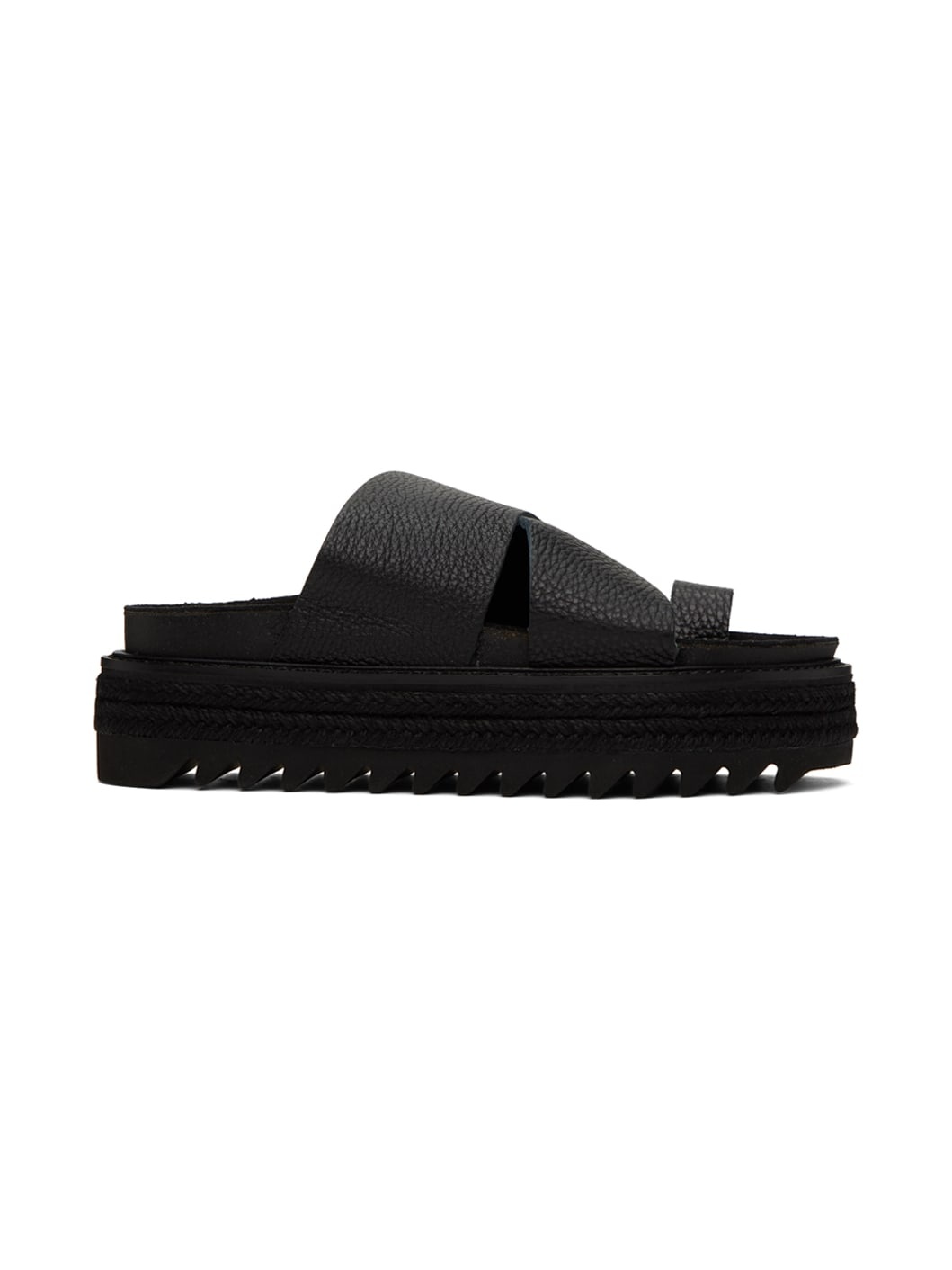 Pebble-grained leather flat sandals in black. · Thong-style strap at open toe · Criss-crossing straps at vamp · Logo embossed at molded leather footbed · Topstitching at welt · Braided jute trim at platform midsole · Treaded foam rubber sole · Platform: H1.5" Supplier color: Black Upper: leather. Sole: rubber. Made in Japan 241731F124003