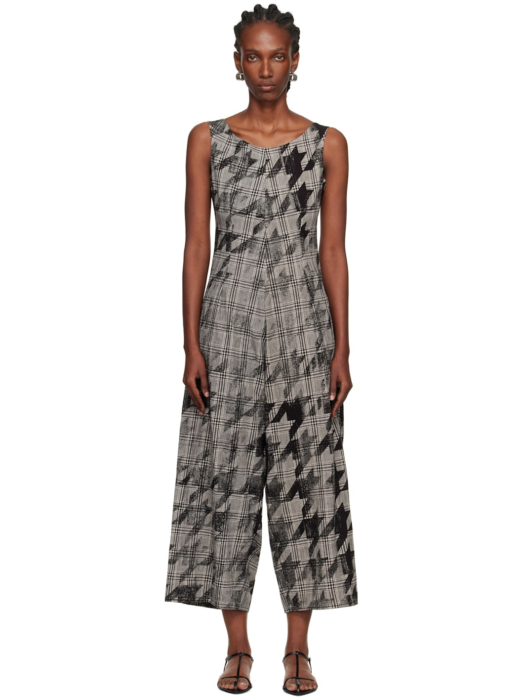 Plain-woven cotton- and linen-blend jumpsuit. · Houndstooth and check pattern throughout · Round neck · Zip closure at side seam · Two-pocket styling · Lace-up closure at back Supplier color: Black 70% cotton, 30% linen. Made in Japan 251731F070000