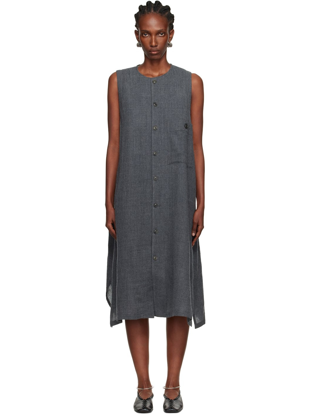 Plain-woven wool midi dress. · Raw edge at crewneck · Button closure · Patch pocket at chest and back · Vented side seams · Full cupro satin lining Supplier color: Grey Body: 100% wool. Lining: 100% cupro. Made in Japan 252731F054000