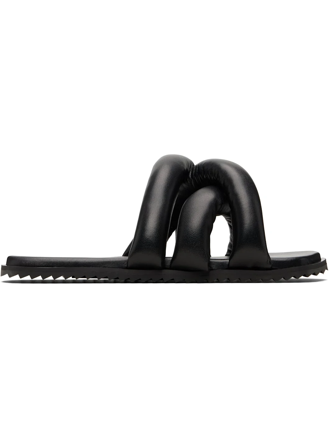 Padded buffed leather slip-on sandals. · Open square toe · Crisscrossing straps at vamp · Logo embossed at padded footbed · Foam rubber midsole · Treaded rubber sole Supplier color: Black Upper: leather. Sole: rubber. Made in Portugal 261844M234018