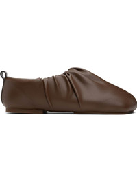Padded buffed faux-leather slip-on loafers in brown. · Square toe · Gathering at collar · Pull-loop at heel collar · Logo embossed at padded footbed · Grained faux-leather lining · Rubber sole Supplier color: Marron Upper: synthetic. Sole: rubber. Made in Portugal 251844M231004