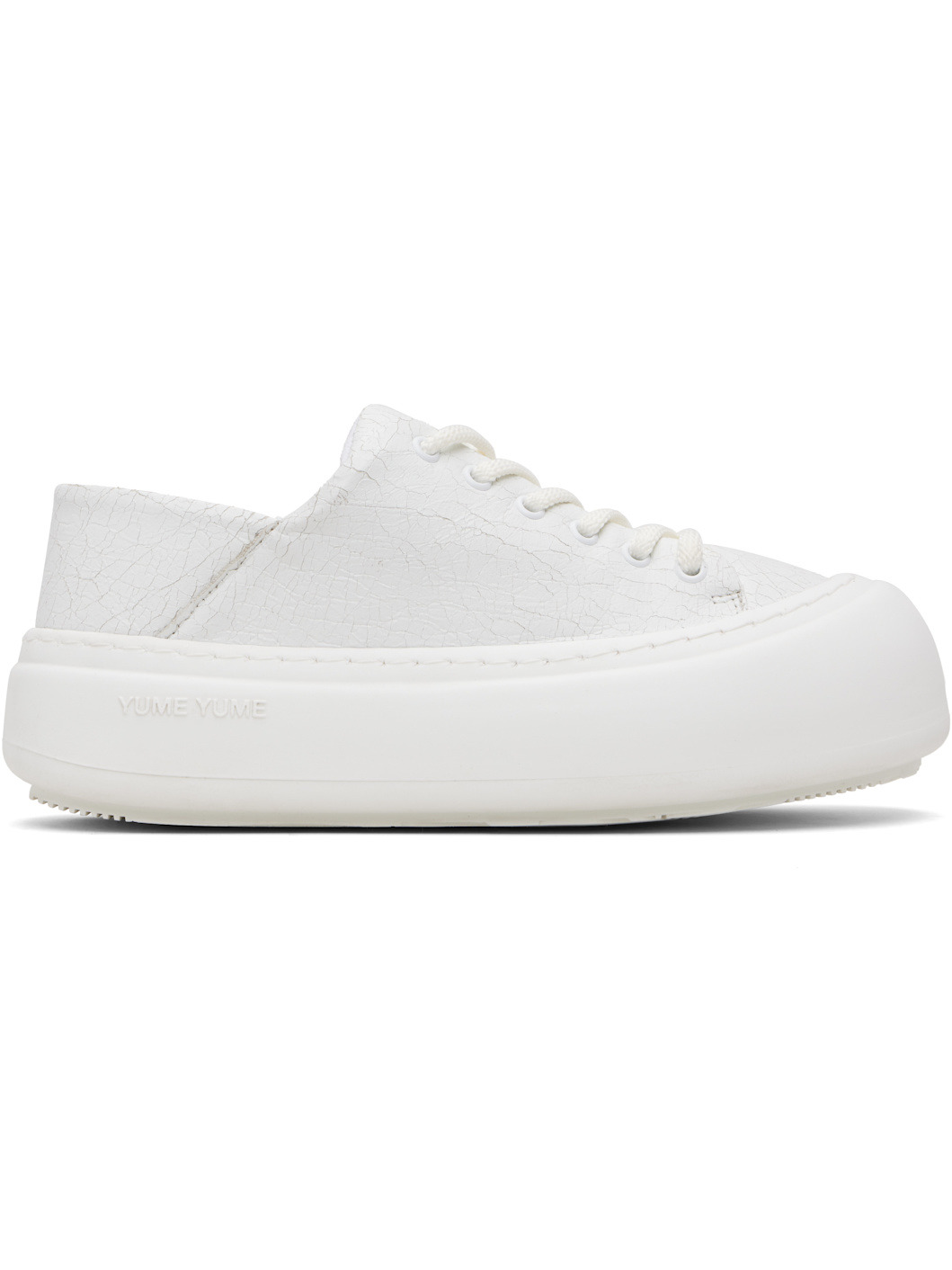 Low-top cracked faux-leather sneakers. · Lace-up closure · Padded tongue and collar · Mesh lining · Logo-embossed rubber platform midsole · Treaded rubber sole · Platform: H1.75" Supplier color: Cracked white Upper: synthetic. Sole: rubber. Made in Portugal 252844M237005