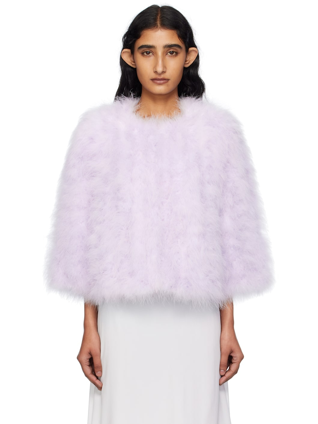 Turkey feather jacket. · Round neck · Single hook-eye closure at front · Full silk satin lining Supplier color: Glycine Body: 100% turkey feathers. Lining: 100% silk. Made in France 252594F062030