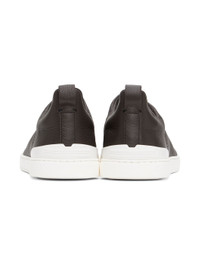 Low-top grained deerskin slip-on sneakers in brown. · Criss-crossing elasticized straps at vamp · Logo embossed at padded tongue · Padded collar · Pull-loop at heel tab · Rubberized heel stabilizer · Textured rubber sole Supplier color: Dark brown