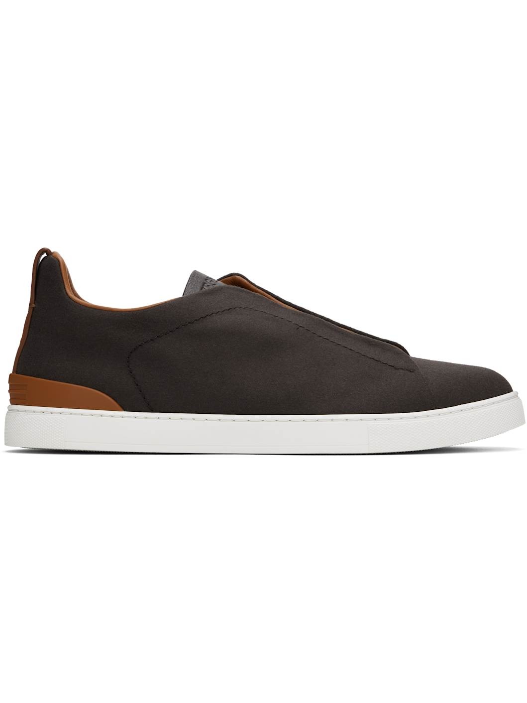 Low-top wool flannel and grained leather slip-on sneakers in brown. · Elasticized closure · Logo embossed at tongue · Padded collar · Pull-loop at collar · Buffed leather lining · Treaded rubber sole Supplier color: Brown Upper: textile, leather. Sole: rubber. Made in Italy 242142M237028