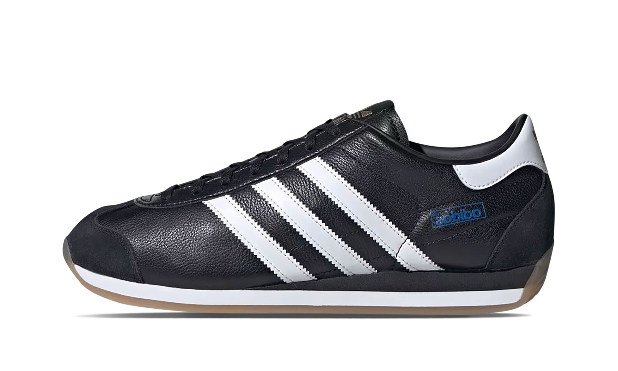 The Adidas Country Japan "Black White" is a classic running shoe re-released as a lifestyle sneaker. It features a predominantly black upper, likely constructed from a combination of nylon and suede, contrasted by white accents on the Three Stripes branding, heel tab, and tongue. The shoe retains the vintage low-profile runner silhouette and gum rubber outsole characteristic of the original Country model.