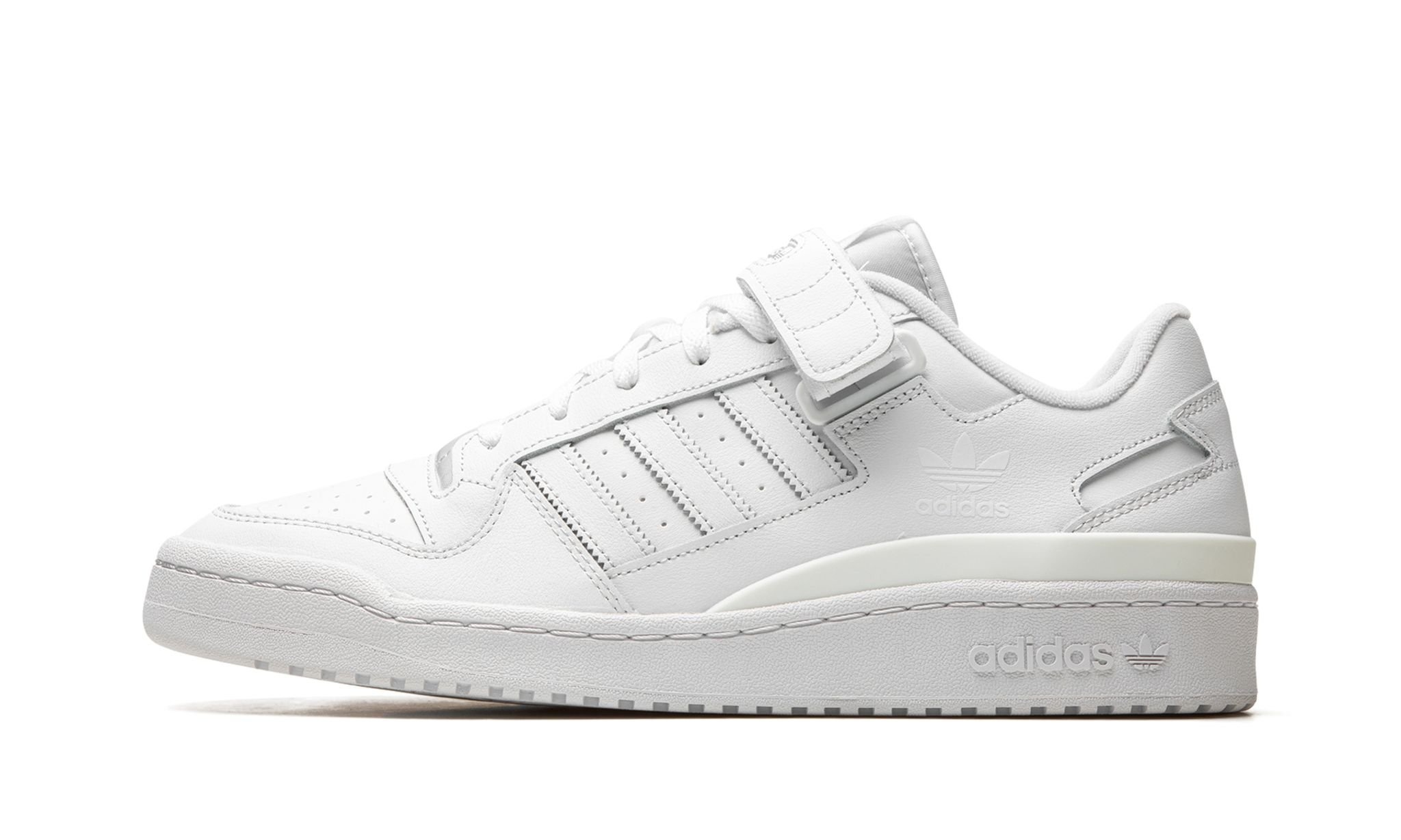 The adidas Forum Low “Triple White” is a monochromatic white colorway of the retro basketball shoe. The Forum Low is an old school basketball sneaker that is currently one of the brand’s most popular and versatile lifestyle shoes, especially in this “Triple White” edition. The shoe features a white leather construction with tonal leather overlays. White leather Three Stripes branding appears on the mid-panel. The shoe’s adjustable ankle strap is also made of white leather. Underfoot, a white rubber sole completes the sneaker’s all-white-everything look.