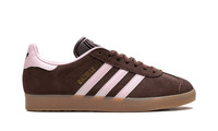 The Gazelle is one of ADIDAS's most iconic and timeless silhouettes, originally designed as an all-around training shoe. This specific edition features a low-profile build with an upper primarily in Auburn (a reddish-brown tone), which is typically constructed from high-quality suede. The classic three-stripes branding and heel tab are highlighted in Clear Pink, providing a soft, contrasting pop of color. The shoe maintains the signature design elements, including a textured tongue, T-toe overlay, and a rubber outsole.