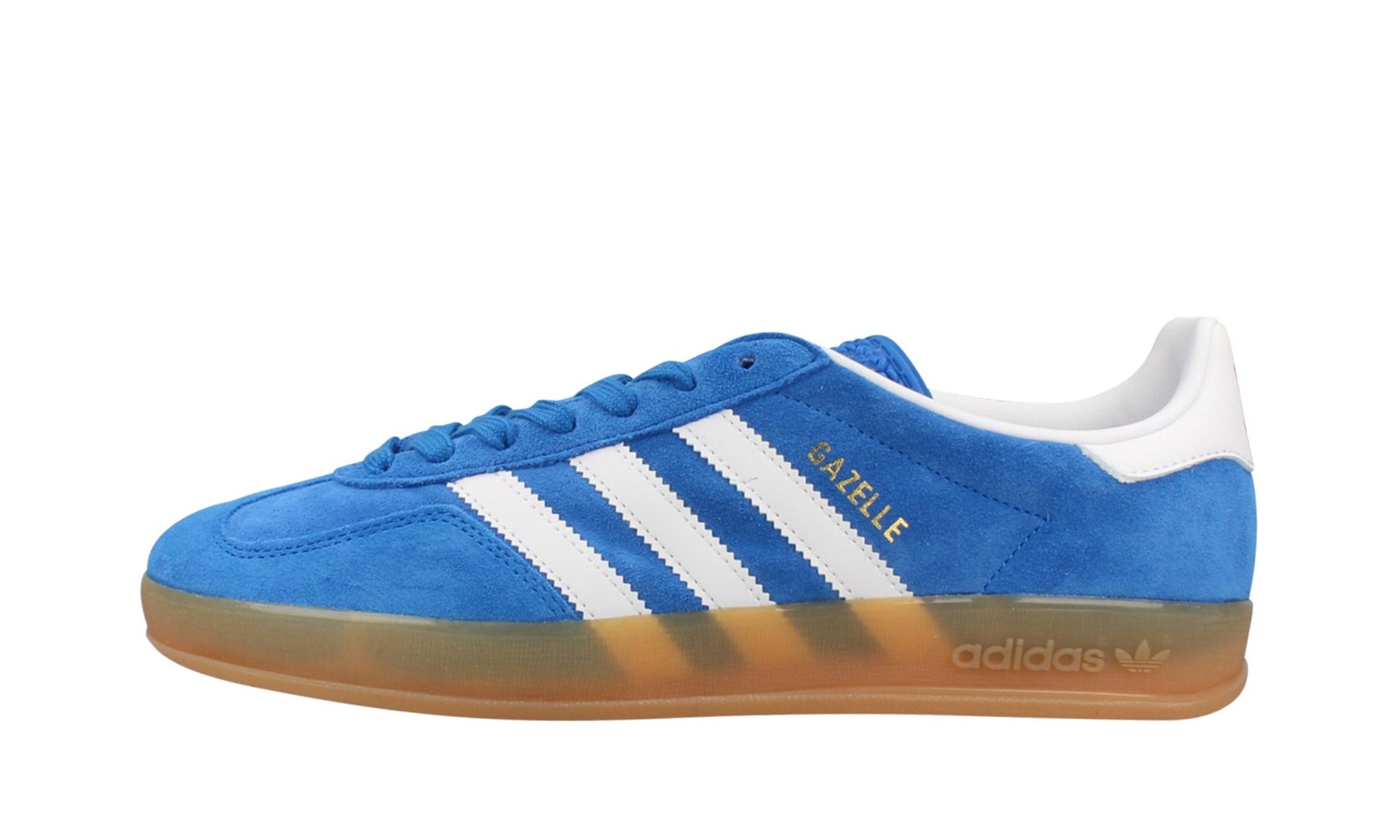 The Adidas Gazelle Indoor "Blue" brings a vibrant update to a classic silhouette. This sneaker features a striking blue suede upper contrasted by crisp white leather three-stripes and a heel tab. It is elevated with a distinctive, translucent gum rubber outsole that gives it a vintage, indoor-sport aesthetic. A timeless design, the Gazelle Indoor combines retro appeal with a modern pop of color, making it a versatile shoe for everyday wear.
