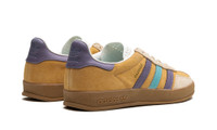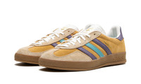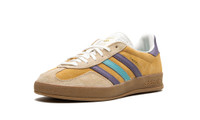 The adidas Gazelle Indoor “Orange/Purple” is a colorway of the retro shoe with a throwback-inspired look. The upper is complete with a washed orange suede construction and a tan suede overlay on the toe. Multicolor Three Stripes branding appears on the sides, while a purple leather overlay can be found on the heel. Gold “adidas” branding appears on the textured white tongue. A gum rubber sole completes the look.