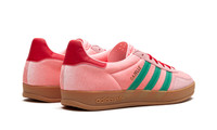The women's adidas Gazelle Indoor "Pink Velvet" blends retro charm with luxury. Pink velvet and suede overlays define the upper, while green 3-Stripes and a gold "Gazelle" logo add contrast. Red accents on the laces and heel pop against the soft hues. A gum rubber outsole provides classic comfort. This design offers a plush feel and a vibrant palette, with extra pink laces for versatile styling. The shoe merges vintage aesthetics with modern flair, creating a standout, elegant look.