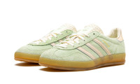 The Women’s adidas Gazelle Indoor “Semi Green Spark” is a women’s-exclusive colorway of the retro indoor soccer shoe with an old school look. The upper features a Semi Green Spark suede constructed that gives the sneaker a 1970s-era vibe. Vintage-inspired cream-colored leather Three Stripes branding appears on the sides and a gold “Gazelle” logo can be found on the lateral side of the midfoot. Additional adidas detailing is seen on the blue textured tongue. A semi-translucent gum rubber sole completes the look.