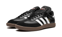 The adidas Samba “Black” is a mostly monochromatic black colorway of the easy-wearing lifestyle shoe. The Samba has enjoyed a resurgence in popularity in recent years, with more and more people from all walks of life coming to appreciate the model’s timeless looks, comfort, and versatility, especially in the “Black” makeup. The upper features a black leather construction with tonal suede overlays on the toe and forefoot. White Three Stripes branding is found on the sides. “Samba” detailing appears in gold foil lettering on the lateral side of the shoe and an “adidas Samba” can be found on the tongue. A dark gum rubber sole completes the look.
