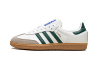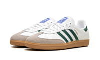 The adidas Samba OG "Collegiate Green" is a colorway of the retro shoe with green accents. The upper features a white leather base contrasted with a grey suede overlay on the toe, and a green leather panel on the heel tab. Collegiate Green leather Three Stripes appear on the sides, while a gold foil “Samba” logo can be seen on the lateral side of the mid-panel. Classic adidas Samba detailing is printed on the tongue. A gum rubber sole completes the look.