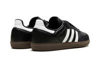 The adidas Samba OG is a low-top silhouette born on the indoor soccer field. The classic silhouette sports a black leather upper with suede overlays on the toe and heel. Contrasting white leather brings attention to the Three Stripes on each side panel and heel tab. A blue logo stamped on each tongue and "Samba" written in gold foil on each side panel act as signature branding hits. The soccer shoe sits atop a brown rubber outsole.