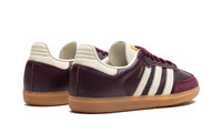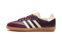 The Women’s adidas Samba OG “Maroon/Cream White” is a women’s-exclusive colorway of the classic indoor soccer shoe with a maroon-based appearance. The upper features a maroon leather base with a tonal suede overlay on the toe. Cream White Three Stripes branding appears on both sides, while a gold “Samba” logo can be found on the lateral side of the midfoot. Gold adidas branding appears on the Cream White tongue. Underfoot, a gum rubber sole rounds out the look.