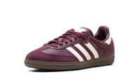 Bring a touch of exotic luxury to your rotation with the adidas Samba OG WMNS "Snakeskin Maroon" (IH3979). This women's exclusive elevates the iconic indoor soccer silhouette by trading traditional leather for a bold, textured snakeskin-embossed upper in a rich, deep maroon. The design maintains its heritage DNA with a classic suede T-toe overlay in a matching tonal maroon, providing a soft contrast to the glossy scales. Crisp "Cream White" serrated Three Stripes and a matching heel tab cut through the dark palette, while gold-foil "SAMBA" branding adds a premium finish. Anchored by the legendary dark gum rubber cupsole, this pair perfectly balances the rugged terrace aesthetic with a high-fashion, maximalist twist that’s sure to stand out.