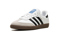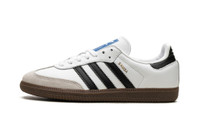 The Women’s adidas Samba “White/Black/Gum” is the women’s sizing of the retro sneaker in one of its most classic and popular colorways. Timeless and versatile, the Samba in “White/Black/Gum” features a white leather upper with black leather Three Stripes and gold “Samba” branding on the side. A black leather heel tab contrasts the shoe’s white leather construction. Classic “adidas Samba” detailing can be found on the tongue in blue. A gum sole completes the look.