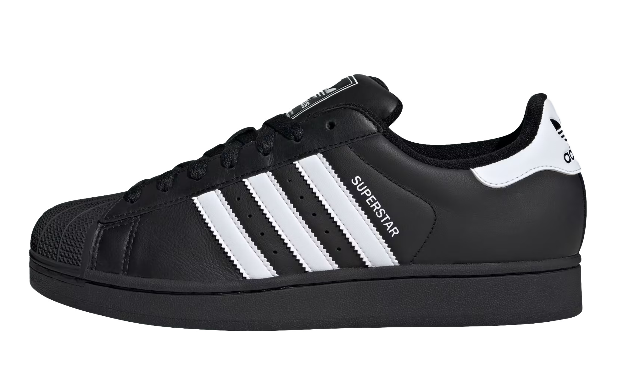 The Superstar 2 'Core Black Cloud White' shoe features a sleek core black upper with contrasting cloud white details, offering a classic and versatile look for everyday wear.