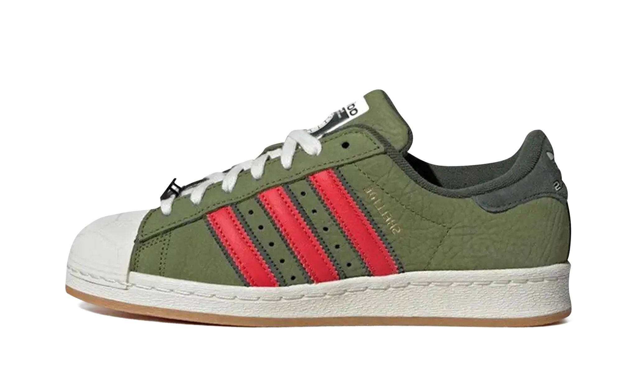 The Teenage Mutant Ninja Turtles x adidas Superstar "Shelltoe" is a collaboration between the iconic animated series and adidas on a colorway of the classic shoe inspired by the former’s main characters. Teenage Mutant Ninja Turtles was birthed as a comic book series before becoming an animated series on television and a film franchise thereafter. The “Shelltoe” draws inspiration from the 40th anniversary of the Teenage Mutant Ninja Turtles franchise. It features a green leather upper with a turtle shell pattern on the white rubber shell toe. Contrasting red leather Three Stripes and gold foil “Shelltoe” branding appear on the sides, while co-branding can be found on the tongue. Release date: March 22, 2024