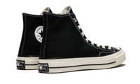 The Converse Chuck 70 Hi “Black” is the ultimate retro sneaker that infuses heritage styling with modern footwear technology. Though it bears close resemblance to the ‘70s-era model it is inspired by, the sneaker is nonetheless an evolutionary design with key upgrades coming in the form of a durable 12oz black canvas upper and thick rubber midsole. A classic Converse branding patch adorns the inside of the shoe while thick cream-colored cotton laces are a nod to the laces that appeared on the ‘70s-era Chuck Taylor All Star. The Chuck 70 is equipped with a soft insole with extra arch support for all-day comfort. Finally, a vintage Converse license plate on the heel ties together the nostalgic looks of the legendary Chuck 70.