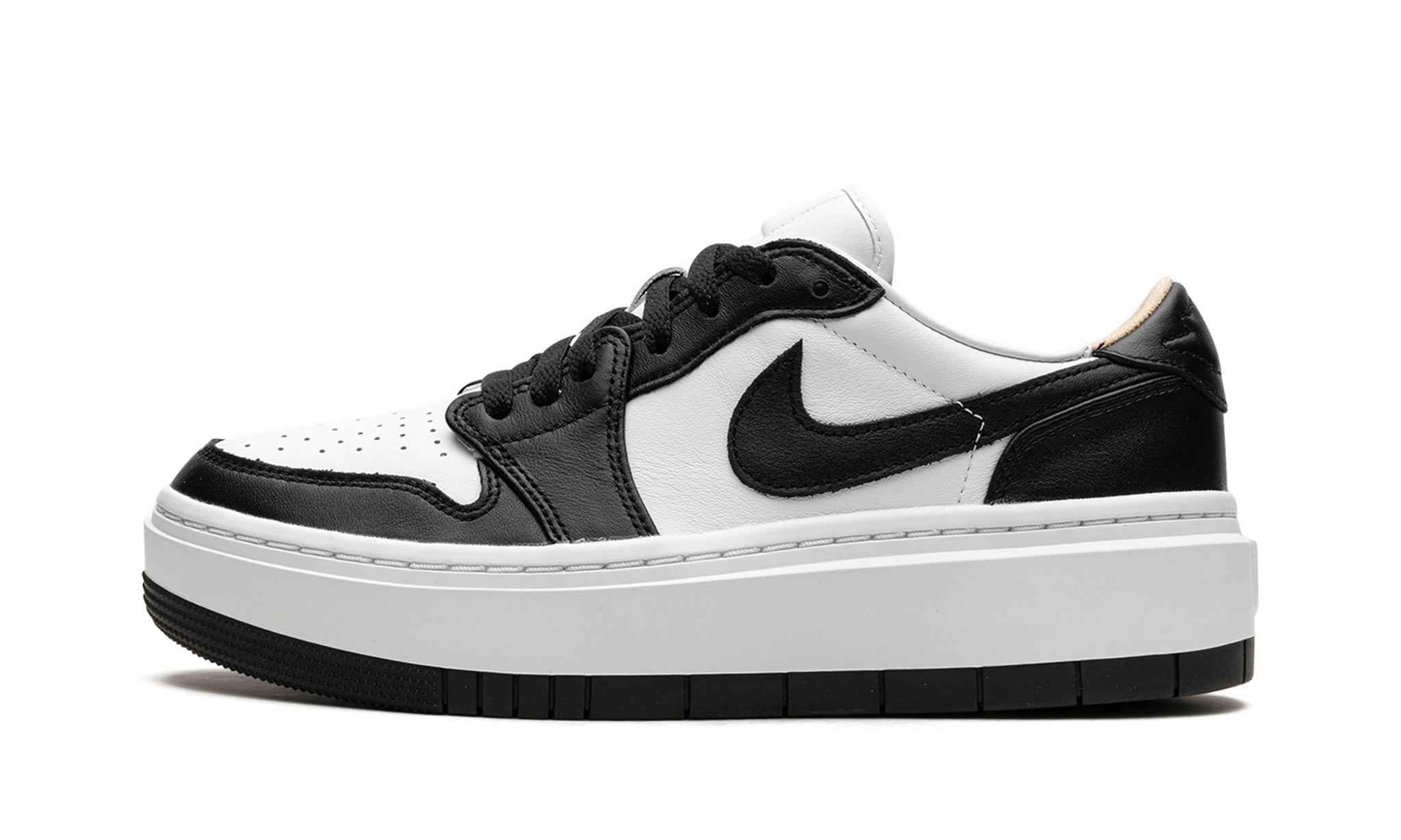 The Women’s Air Jordan 1 Elevate Low “Panda” is a women’s-exclusive colorway of the retro basketball shoe with a modified platform-style sole. The Jordan 1 Elevate Low updates the Jordan 1 Low with an oversized, white rubber midsole that adds height to the wearer while giving the shoe a modern look. The “Panda” features a white leather base with contrasting black leather overlays and Swoosh branding. A “bubble” style “Wings” logo. Underfoot, the platform rubber sole adds a boost in height. Release date: February 1, 2023