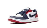 The Air Jordan 1 Low Golf "USA" is a patriotic colorway of the low-top golf shoe by Jordan Brand. Based on the Air Jordan 1 Low, the Jordan 1 Low Golf is essentially the same shoe as the former, but features nubs on the outsole for traction on a golf course. The “USA” colorway features a red, white, and blue color block, with white leather on the base, and Obsidian leather on the toe, forefoot, eyelets, and Swoosh. Varsity Red leather can be found on the middle eyelet panel and heel. A navy “Wings” logo appears on the heel, while Jumpman and “Golf” logos are seen on the tongue tag