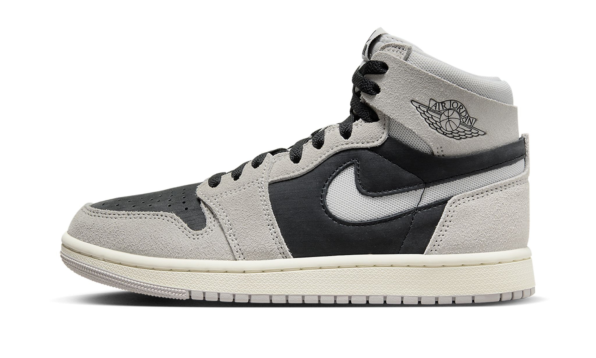 The Women’s Air Jordan 1 High Zoom CMFT 2 "Light Iron Ore" is a women’s exclusive colorway of the modified Jordan 1 with a versatile look. The Jordan 1 Zoom Comfort 2 is the second version of the Jordan 1 Zoom Comfort shoe that debuted as a lifestyle take on the classic silhouette with added comfort. The “Light Iron Ore” features a black suede base with Light Iron Ore suede overlays. A Coconut Milk cut-out Swoosh appears on the sides and a “Wings” logo is found on the collar. “Zoom Air” branding replaces the Jordan 1’s original “Nike Air” detailing on the tongue tag. Underfoot, the Jordan 1 Zoom Comfort 2 features Nike’s Zoom Air cushioning technology in the forefoot as well as additional foam. Release date: August 1, 2023