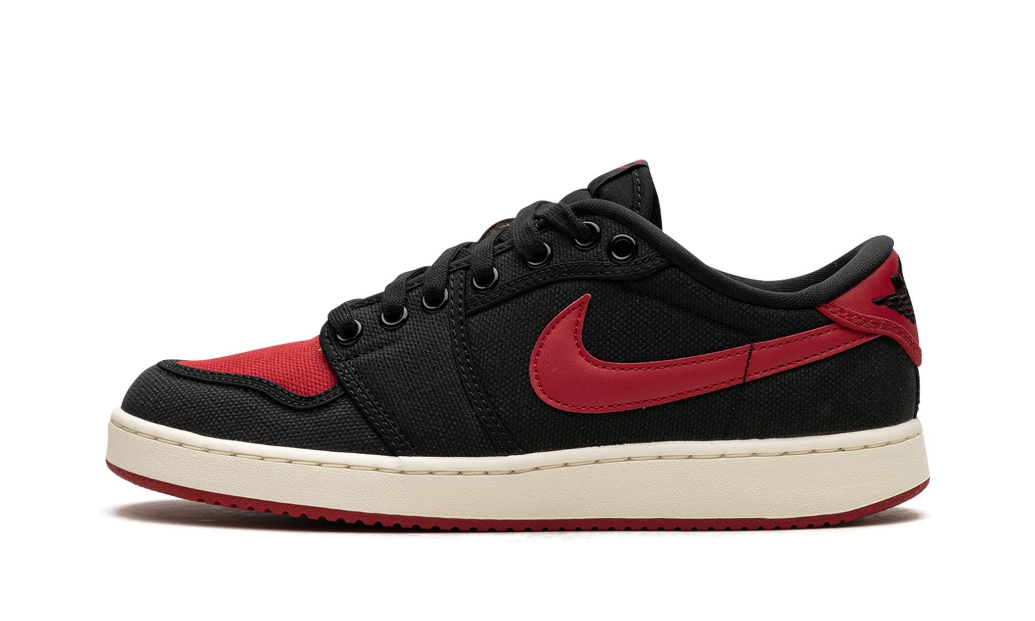 The Air Jordan 1 KO Low “Bred” is a colorway of the low-top version of the retro basketball shoe that is inspired by an iconic Air Jordan style. The shoe we’re referring to is the Air Jordan 1’s original “Bred” colorway that was worn by Michael Jordan with the Chicago Bulls. In addition to appearing on the Jordan 1, the “Bred” theme was also released on the original version of the Air Jordan 1 KO in 1986. Here, the style returns to the silhouette, but on the low-top model. The shoe has a mostly black canvas construction save for the Varsity Red canvas toe and the Varsity Red leather Swoosh. A black “Wings” style “AJKO” logo appears on the heel and a red “Nike” logo is found on the tongue. The Jordan 1 KO Low has the same midsole as the Nike Vandal, and is designed in a vintage-inspired cream hue here. Release date: August 23, 2023
