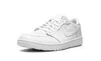 The Air Jordan 1 Low Golf “Triple White” is a monochromatic white colorway of the version of the vintage basketball shoe designed for golf. The “Triple White” is one of multiple Jordan 1 Low Golf styles released by Jordan Brand in 2022. Designed for the fairway, style elements include an all-white leather construction with a white leather Swoosh on the sides. Tonal “Wings” branding is found on the heel. Additional branding appears on the tongue tag, where a Jumpman and “Golf” detailing are found in white. Small nubs on the outsole provide traction on a golf course. Release date: March 5, 2022