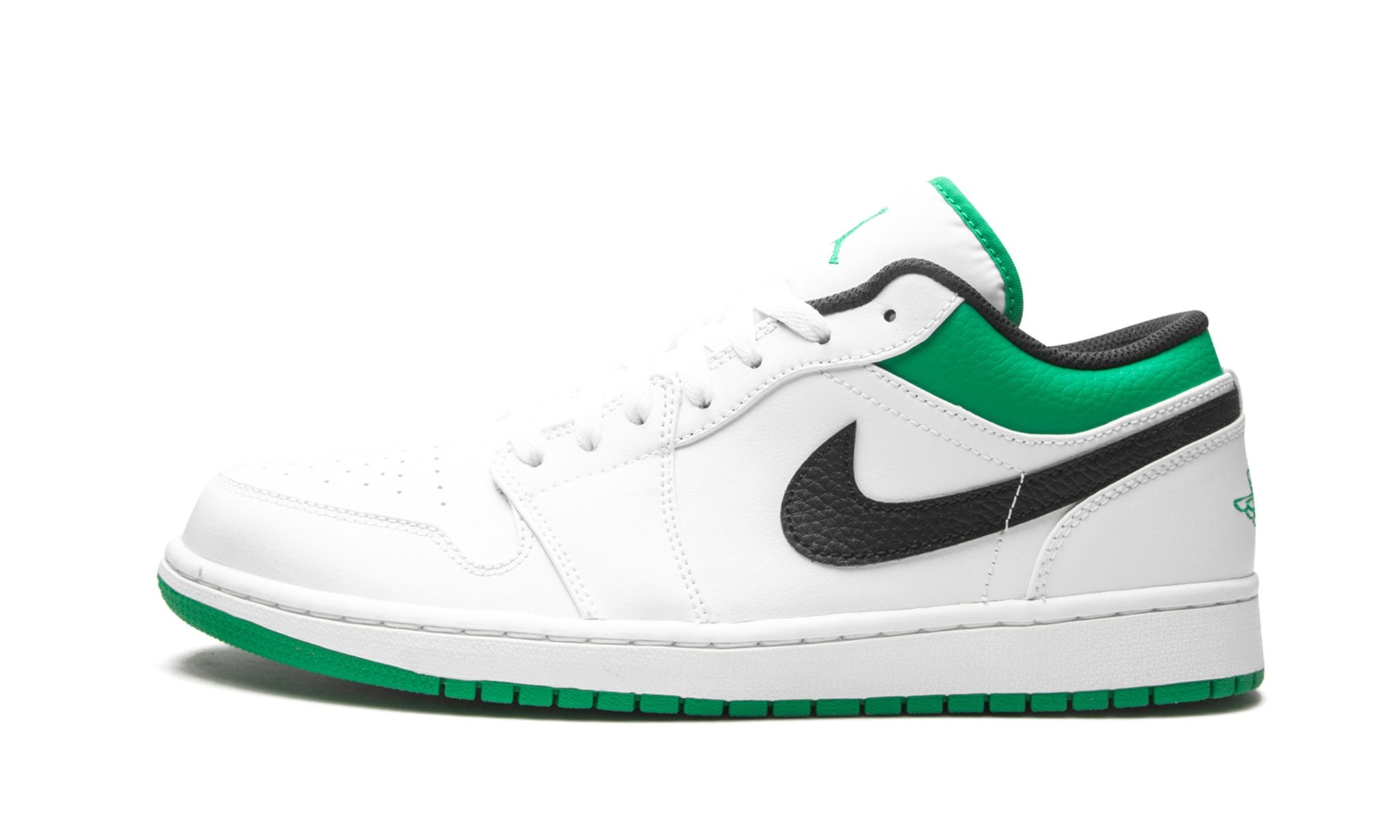 The Air Jordan 1 Low “White/Lucky Green” unofficially honors a longtime rival of Michael Jordan’s Chicago Bulls: the Boston Celtics. The “White/Lucky Green” colorway of Michael’s legendary first signature shoe was released in Spring 2021 and features the white, black, and green color scheme of the Celtics’ team uniforms. Without saying as much, the assortment of colors is a nod to the Celtics. White tumbled leather forms the base of the shoe. A black tumbled leather Swoosh appears on both sides and a Lucky Green embroidered “Wings” logo on the heel. Additional green accenting can be found on the leather panel on the collar and on the underside of the white nylon tongue. Jordan Brand adds a black Jumpman to the forward-facing side of the tongue for a timeless, retro look.