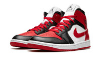 The Women’s Air Jordan 1 Mid “Alternate Bred Toe” is a women’s-exclusive colorway of the lifestyle shoe that remixes the Jordan 1’s original “Black Toe” look. The “Alternate Bred Toe” features the black, white, and red team uniform colors of Michael Jordan’s former team, the Chicago Bulls, and modifies the Air Jordan 1’s original “Black Toe” colorway with its red perforated leather toe and black leather toe cap and forefoot overlays. The mid-panel is designed in white leather while the collar, heel, and Swoosh appear in red leather. A classic black “Wings” logo can be found on the collar and a black Jumpman with “Air” detailing is located on the white nylon tongue tag on the white nylon tongue. Finishing touches include red laces, a white rubber midsole, and red outsole.
