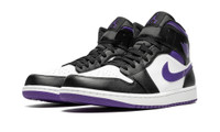 The Air Jordan 1 Mid “Dark Iris” is a colorway of the mid-top version of Michael Jordan’s first signature shoe that unofficially shows love to the Sacramento Kings. Dressed in the basketball team’s black, white, and purple team uniform colors, the “Dark Iris” is in no way affiliated with the Kings, but brings to mind all of the great Player Exclusive Air Jordan colorways worn by former Kings players and Team Jordan members Mike Bibby and Mitch Richmond. The shoe features a white perforated leather toe and mid-panel. Contrasting black leather overlays appear on the forefoot, eyelets, collar, and heel. A Dark Iris leather Swoosh is found on the sides. The purple hue also appears on the “Wings” logo, on the collar, and on the Jumpman and “Air” branding on the tongue tag.