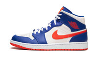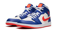 The Air Jordan 1 Mid “Knicks” is a colorway of the casual sneaker that features the team uniform colors of the New York Knicks. The “Knicks” Jordan 1 Mid is not officially associated with the basketball team, but still features its uniform colors on its design in an intriguing way. The shoe sports a white leather base with Game Royal leather overlays on the toe, forefoot, eyelets, collar, and heel. A Rush Orange leather Swoosh is found on either side of the shoe and orange “Wings” branding appears on the collar. The Rush Orange nylon tongue tag features Jumpman and “Air” detailing. Underfoot, the white midsole is paired with an orange rubber outsole. Release date: February 17, 2023