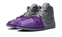 The Sheila Rashid x Air Jordan 1 Mid “Unite” is a collaboration between the bespoke designer and Jordan Brand as part of the Unite campaign. Here, Michael Jordan’s first signature shoe is lowered in height to the mid-top silhouette, and features a distinct color block. Court Purple tumbled leather appears on the perforated toe and forefoot. From the mid-panel on, grey suede detailing is introduced into the design. The hairy material dots the mid-panel, collar overlay, and heel. Tonal “Wings” insignia is located on the collar. Leather Swooshes appear on either side of the shoe. The grey nylon tongue and tongue tag with Jumpman detailing are contrasted by purple accenting on the throat and laces. The midsole continues the split color blocking with purple paint in the same area as the upper. Release date: March 2, 2020.