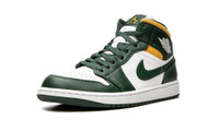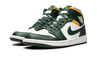 The Air Jordan 1 Mid “Sonics” is a colorway of Michael Jordan’s first signature shoe in the mid-top silhouette that features the former team uniform colors of the Seattle Supersonics. The now-defunct Sonics, who relocated to become the Oklahoma City Thunder in the late 2000s, wore green-and-yellow team uniforms and were among the most popular basketball teams in the NBA back in the day. The “Sonics” Jordan 1 Mid unofficially honors the team with Noble Green leather overlays against a white leather base. A green leather Swoosh resides on either side of the shoe. A white “Wings” logo is found on the collar and white Jumpman and “Air” detailing appears on the green leather tongue tag. A Pollen-colored collar adds to the Sonic-inspired look.