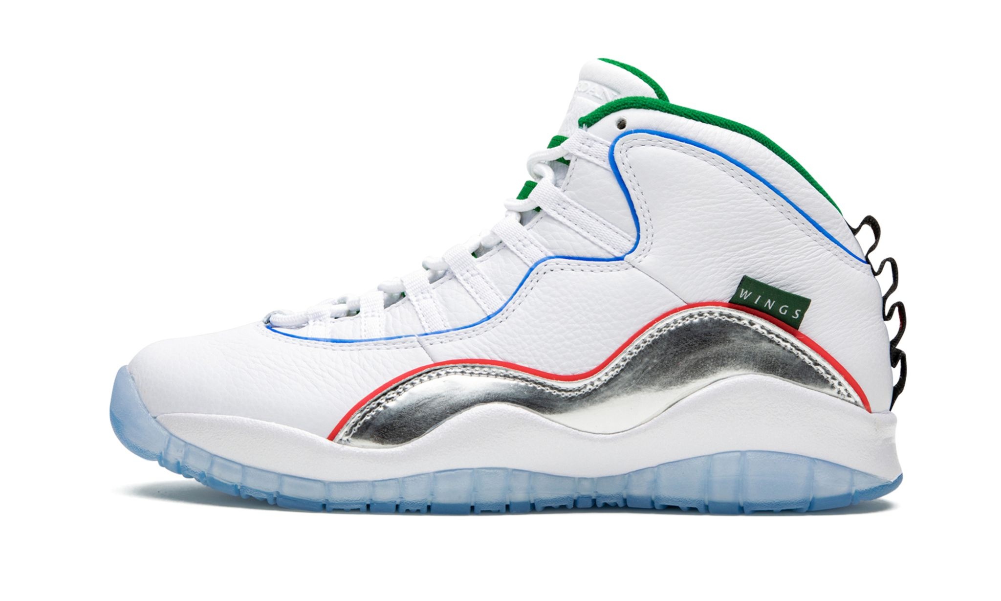 The Air Jordan 10 “Wings” is a special colorway that was released during the NBA All-Star Weekend 2020 festivities. The model was included as part of Jordan Brand’s 8x8 Collection which recruited four students in the greater Chicago area to lend their creative talents to some of the most iconic Air Jordans of all time. The upper features soft white leather across the toe, collar, and heel. Taking on a mismatching aesthetic, both shoes feature different colors for the added piping. A flashy silver metallic mudguard adds the cheery vibe of the shoe. Additional design elements include a mini “Wings” tab on the mudguard, a green liner, and a black nylon piece on the heel with dots in the eight colors of Chicago’s transit line. The Air Jordan 10 “Wings” was released on February 15, 2020.