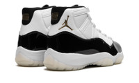 The Air Jordan 11 “Gratitude” is the modern re-release of the colorway of Michael Jordan’s eleventh signature shoe that originally released as part of the “Defining Moments Pack” from 2006. Also nicknamed the “DMP 2023” colorway, this Jordan 11 is based on the retro basketball sneaker’s original “Concord” colorway that was worn by Jordan with the Chicago Bulls throughout the team’s historic run during the 1995-96 NBA season. The upper features a white leather construction, instead of the original DMP colorway's ballistic mesh build. A glossy black patent leather mudguard contrasts the shoe’s neutral base. Metallic Gold Jumpman branding is found on the collar while “Jumpman” detailing appears across the white mesh tongue. Underfoot, the white foam midsole and translucent rubber outsole complete the look. Release date: December 9, 2023