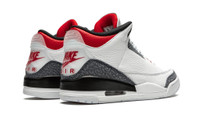 The Air Jordan 3 Denim “Fire Red” is an alternate colorway of Michael Jordan’s third signature shoe that features denim-based accenting. Released in Summer 2020, the Jordan 3 Denim “Fire Red” displays a brand new appearance while retaining the model’s core design details. White leather appears as the base of the upper. Contrasting elephant print finished in a durable denim material is located on the mudguard on the heel, toe cap, and upper eyelets. Fiery red hardware dots the lower eyelets and red dotted leather detailing appears on the collar. Additional details include a black liner, red embroidered Jumpman on the tongue, and translucent heel with dual Jumpman and “Nike Air” insignias. Release date: August 27, 2020.