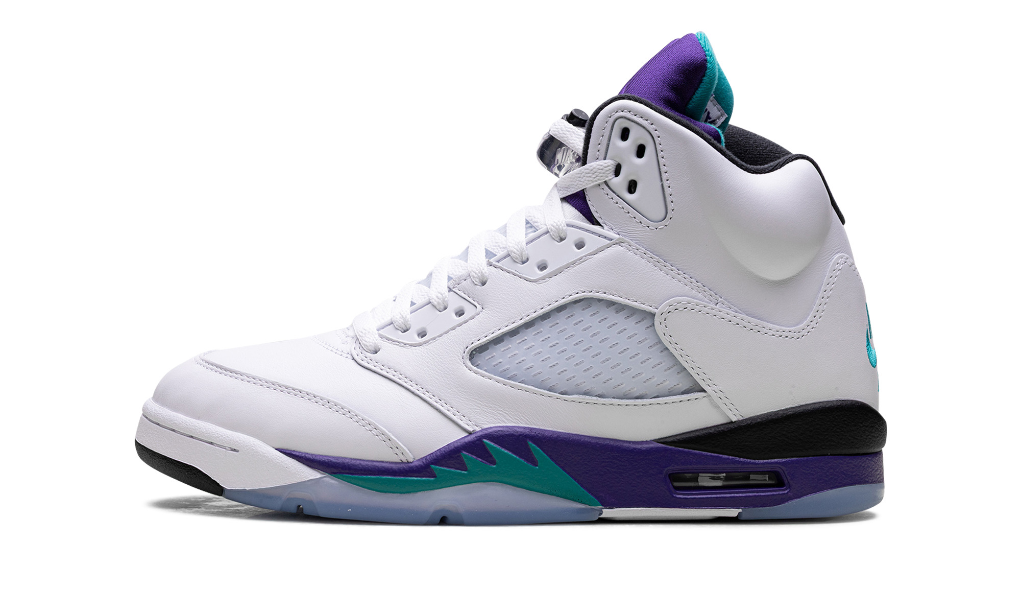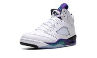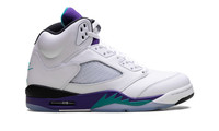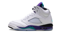 The Air Jordan 5 "Grape" is one of the most popular colorways of Michael Jordan's fifth signature shoe. Popularized by its appearance on the TV show The Fresh Prince of Bel-Air, the "Grape" AJ5 OG returned in 2025. The sneaker features a white upper that is accented with a purple tongue adorned with an aqua Jumpman logo. The Jordan 5 also has purple and aqua accents on the midsole and the Air Jordan 5's signature toggle lace lock.