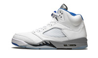 The Air Jordan 5 “Stealth 2.0” is a modern reinterpretation of the popular non-original colorway of the model that was originally released in 2006. The first “Stealth” Jordan 5 debuted during a time period in which Jordan Brand was re-imagining its core classic Air Jordan models as “lifestyle” shoes by arranging them in materials and colors that could be worn off the court. The look of the "Stealth 2.0" is quite similar to the original "Stealth" design from 2006. Both feature a crisp white leather upper with translucent netting on the mid-panel and tongue. The “Stealth 2.0” displays a black embroidered Jumpman on the heel, differing from the blue Jumpman logo on the original '06 release. The other main difference is found on the midsole. Both releases feature a grey midsole, but the new "Stealth 2.0" includes black "shark tooth" detailing speckled with blue. The original design features solid blue shark tooth accenting. An icy blue translucent outsole rounds out the look of the shoe. Release date: March 27, 2021.