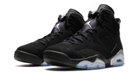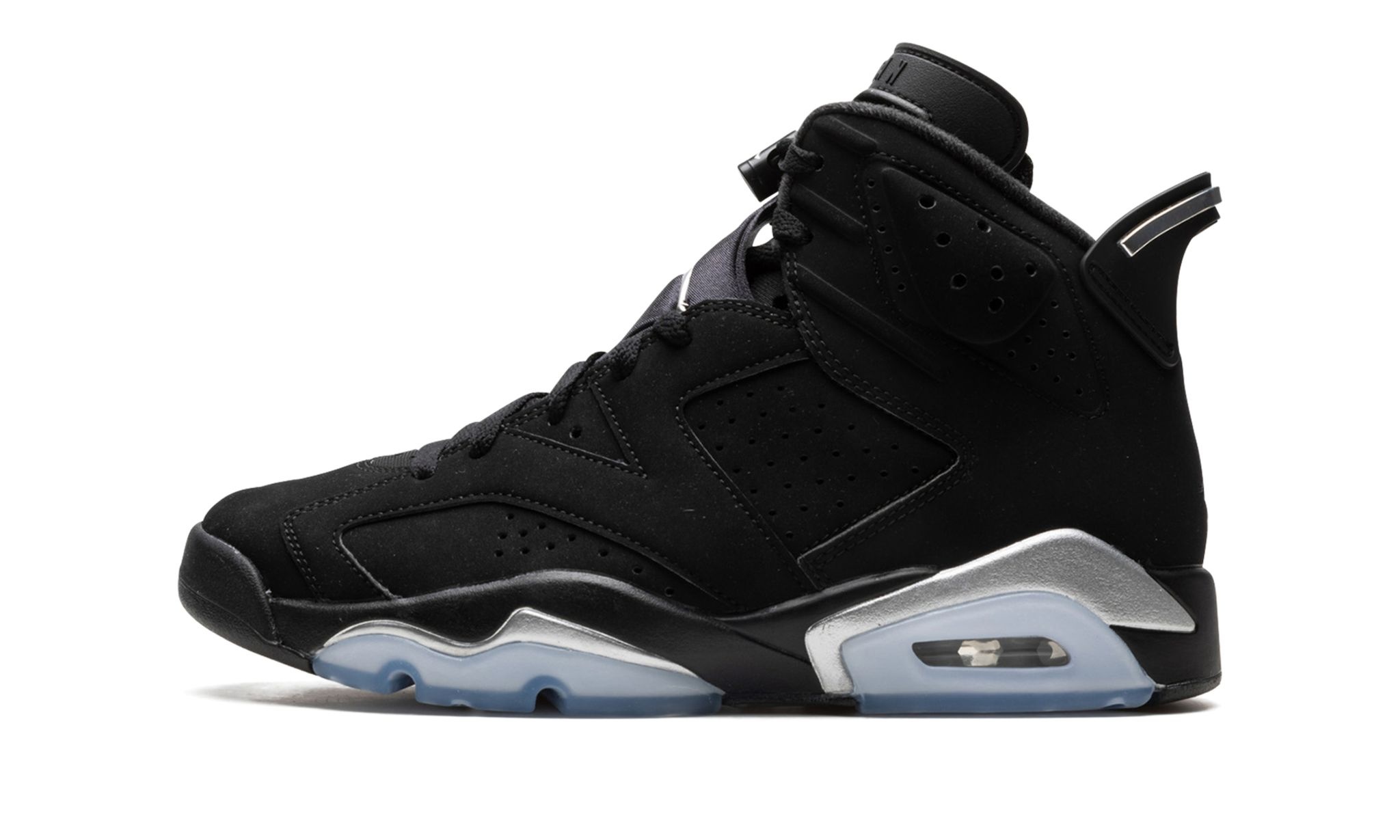 The Air Jordan 6 “Chrome 2022" is the modern reissue of the popular non-original colorway of the retro basketball shoe in mid-top form. Originally released back in 2002 on the Jordan 6 Low, the “Chrome” was brought back on the model’s original mid-top silhouette in November 2022. The modern “Chrome” color block is identical to the original version from back in the day. The shoe features a black synthetic nubuck upper with contrasting Metallic Silver or “Chrome” accents on the mudguard above the visible Air cushioning unit in the heel and on the forefoot. Additional chrome-colored detailing includes a Metallic Silver Jumpman on the tongue, and “23” branding beneath the black embroidered Jumpman on the heel. A small silver Jumpman appears on the lace toggle. Release date: November 12, 2022