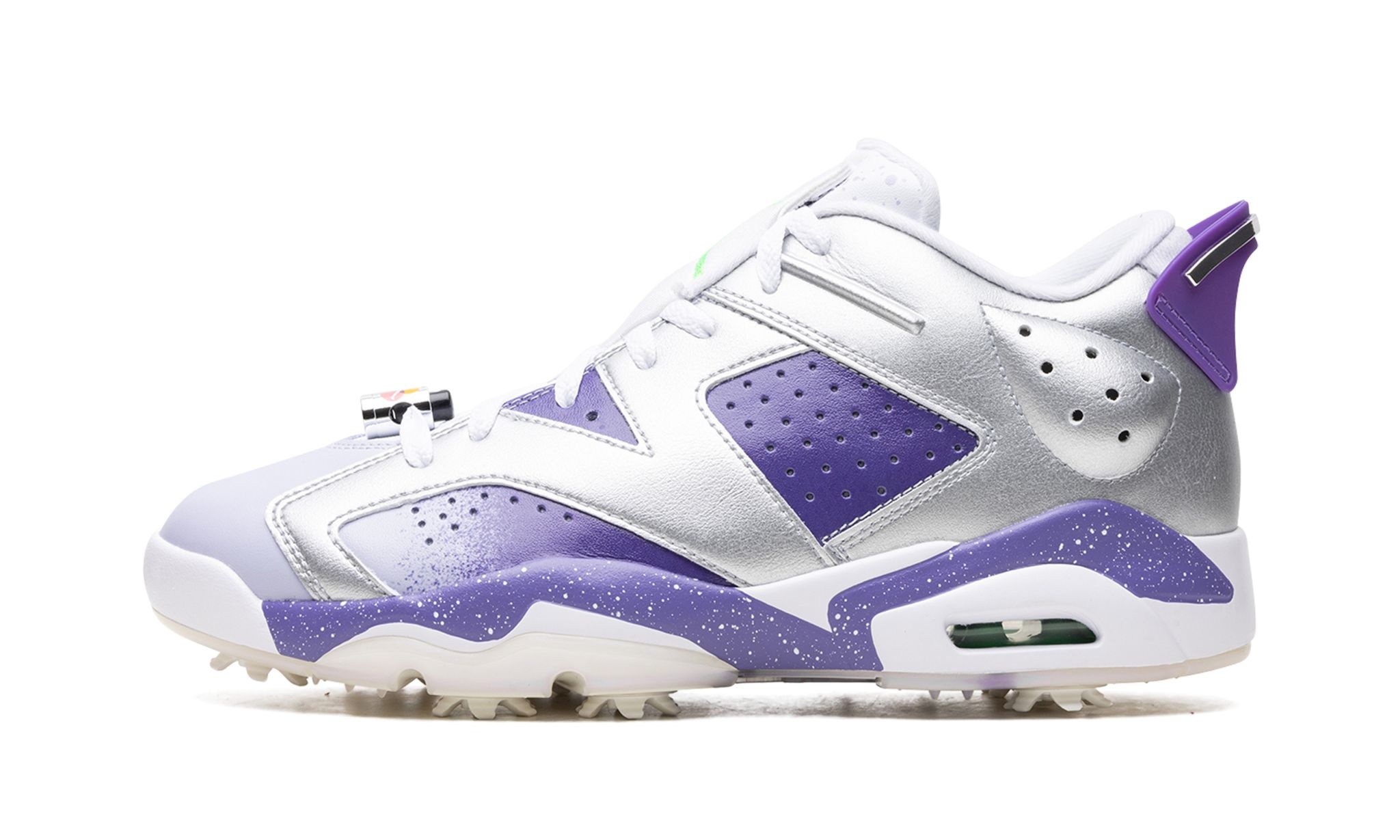 The Air Jordan 6 Low Golf "U.S. Open" is the alternate golf version of the sixth Air Jordan that celebrates the PGA Championship. The Jordan 6 Low Golf “U.S. Open” features a purple airbrush effect with Metallic Silver leather overlays throughout the design. A silver Jumpman is embroidered on the back of the shoe while a neon green Jumpman is embroidered on the tongue overlay. The mid-panel is painted purple with white speckle detailing. Underfoot, nubs on the outsole provide traction on a golf course. Release date: June 16, 2023