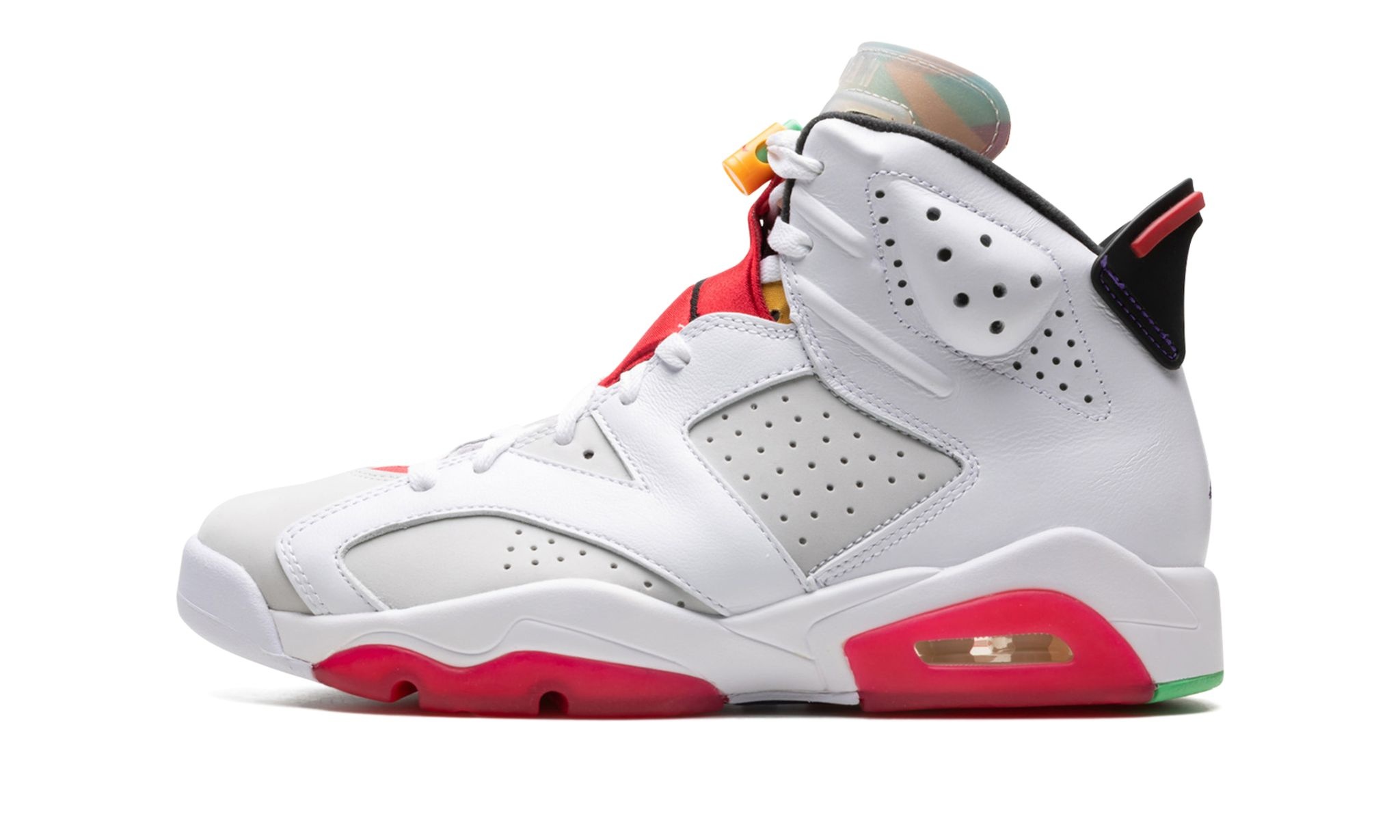 The Air Jordan 6 “Hare” is a Spring 2020 release that features overtures to another classic Jordan shoe: the original Air Jordan 7 “Hare.” Famously appearing on the feet of Bugs Bunny during the early ‘90s television commercials with Michael Jordan, the “Hare” Jordan theme returns with a modern twist as Jordan Brand honors the legacy of “The GOAT’s” sneaker collection. White leather overlays contrast the light grey perforated synthetic nubuck base that appears on the mid-panel and toe. A red neoprene lace cover with a black Jumpman logo sits just below the clear rubber tongue that reveals the multicolor geometric pattern found on the Jordan 7's tongue underneath. An orange and green lace lock that resembles a carrot adds the final special touch for the upper, while red translucent rubber highlights the sole. Release date: Spring 2020.
