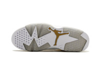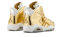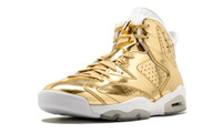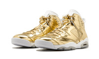 The classic Air Jordan 6 silhouette receives the "P1NNACLE" treatment. Taking a walk on the luxe side, its upper is coated in metallic gold monochromatic patent leather. An offsetting white midsole and heel tab break the monotony. A metallic gold specked outsole and oversized Jumpman hangtag are interesting touches that round out the sneaker.